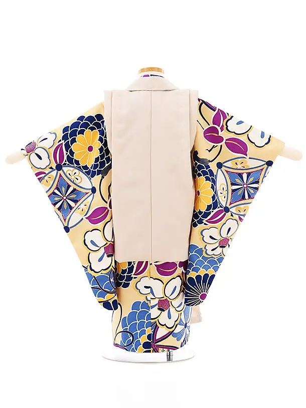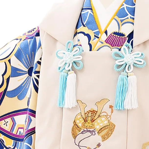 七五三レンタル(3歳男児被布)2655ベージュ刺繍兜xアイボリー椿七宝
