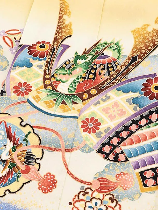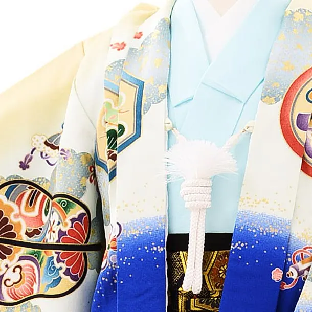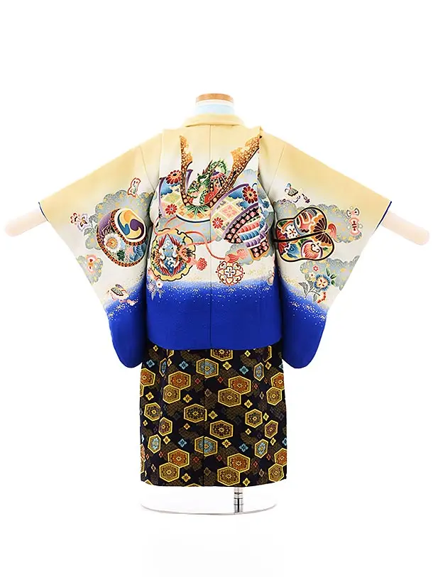 七五三レンタル(2歳男袴)2663ベージュブルーぼかし兜x紺ゴールド袴