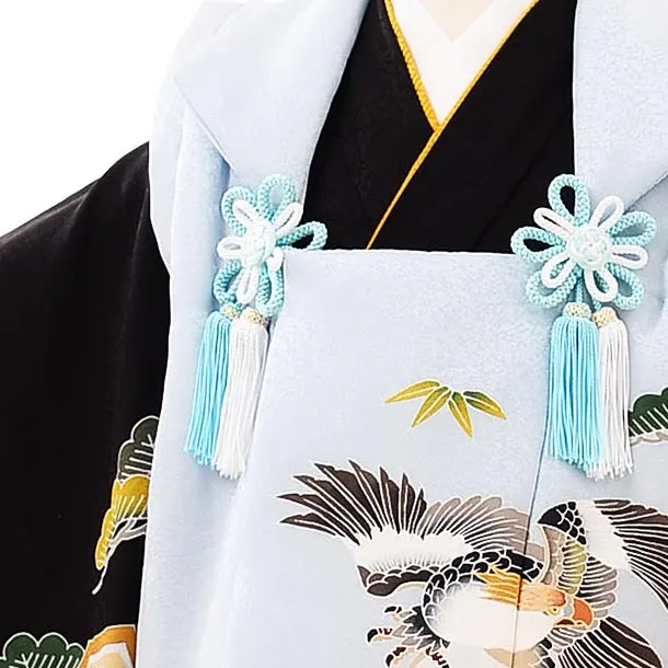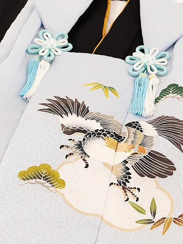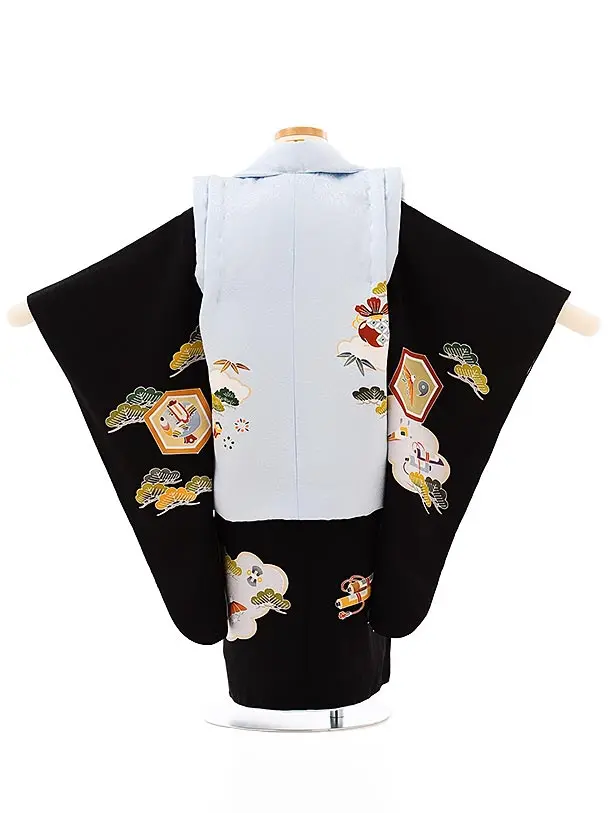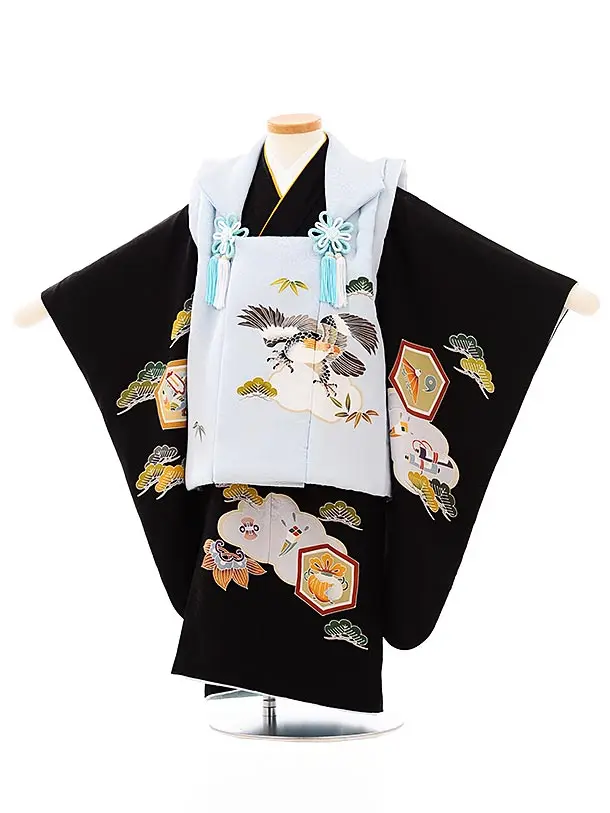 七五三レンタル(3歳男児被布)2664高級正絹 水色鷹x黒地宝尽し