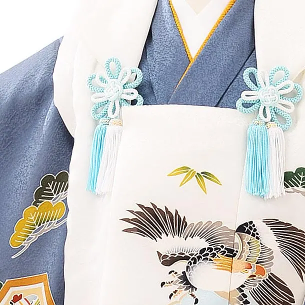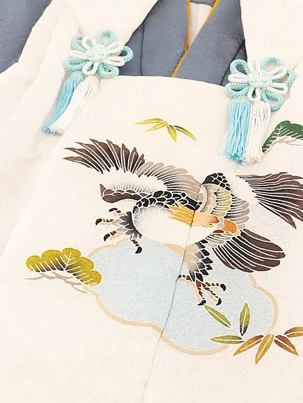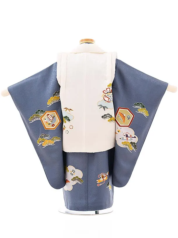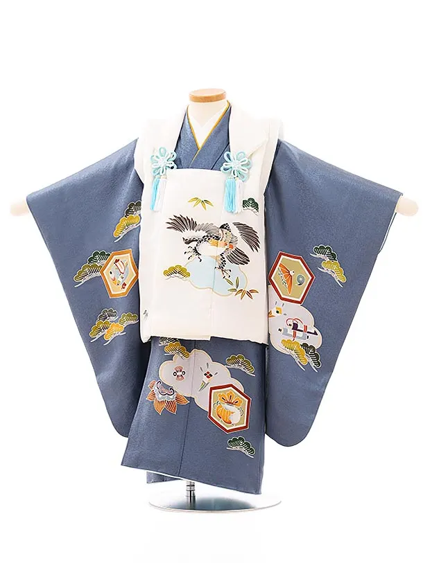 七五三レンタル(3歳男児被布)2666高級正絹 白地鷹xグレー地宝尽し