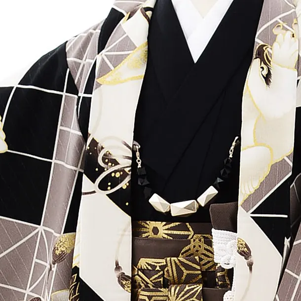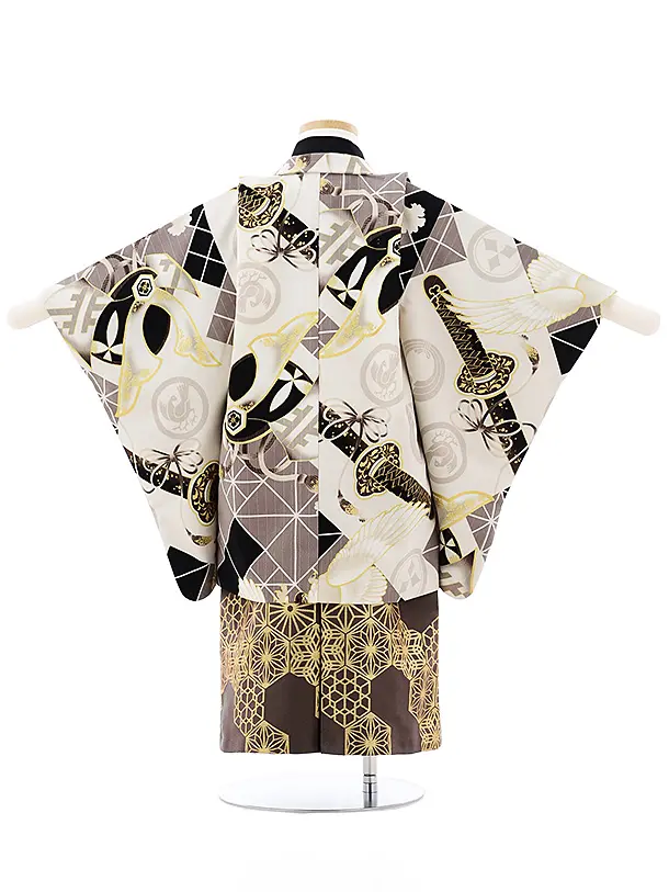 七五三(3歳男袴)2700JAPAN STYLE 黒グレー鷹兜x茶色ゴールド袴