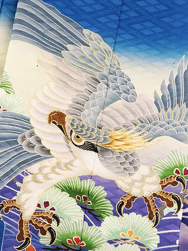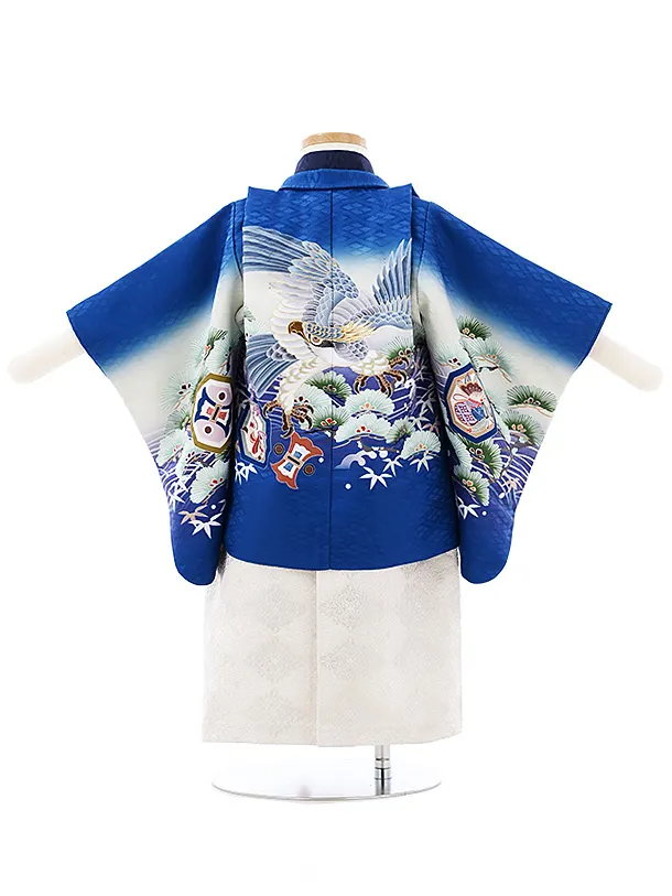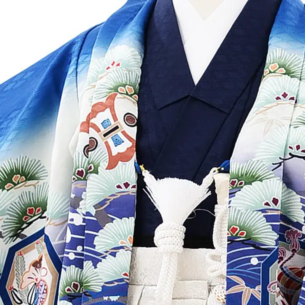 七五三(小さめ2歳男袴)2704ブルーぼかし波松鷹x白シルバー袴
