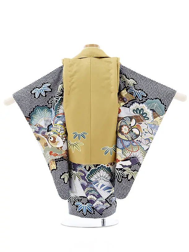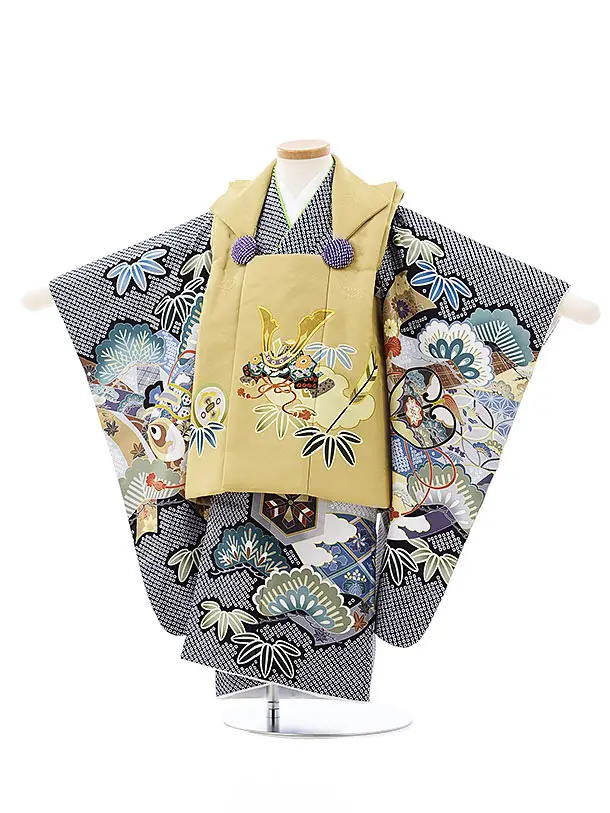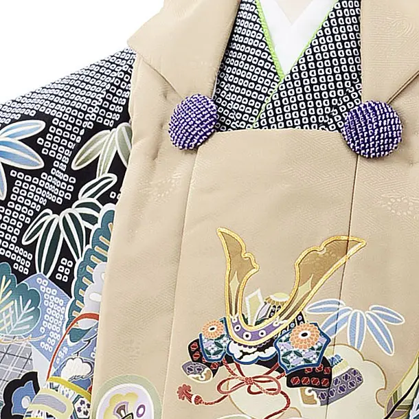 七五三レンタル(3歳男児被布)2720ベージュ地兜x黒疋田柄吉祥文様