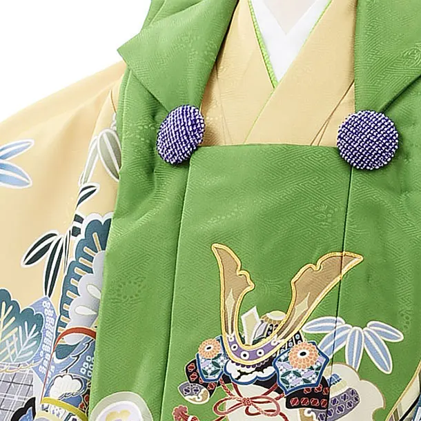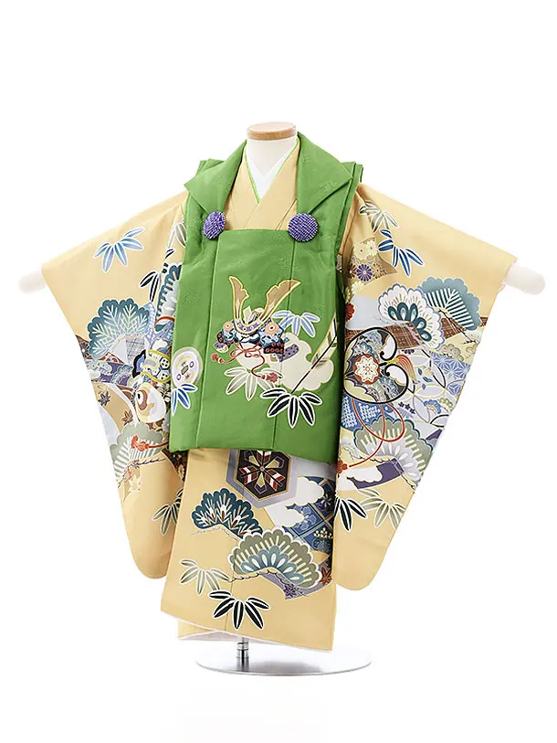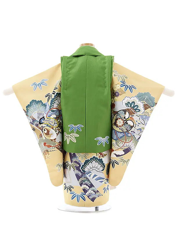 七五三レンタル(3歳男児被布)2722グリーン地兜xからし色吉祥文様
