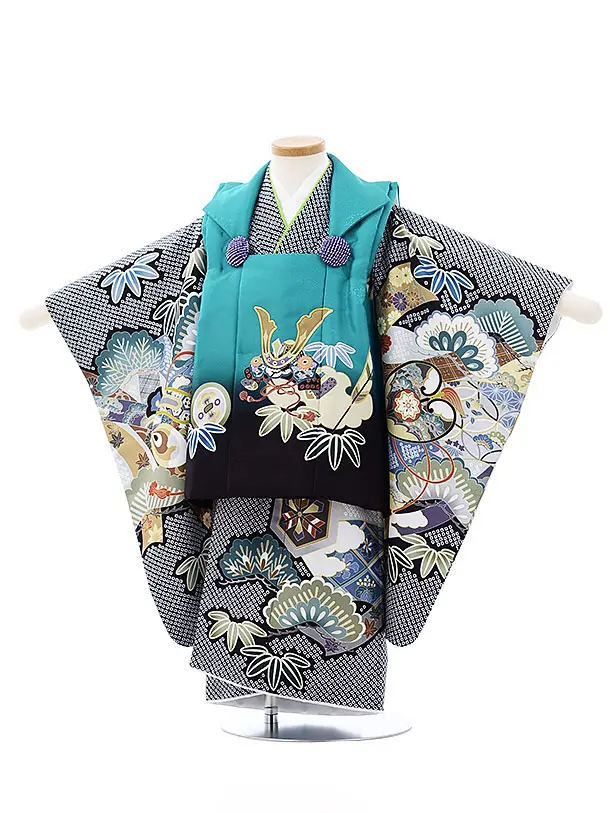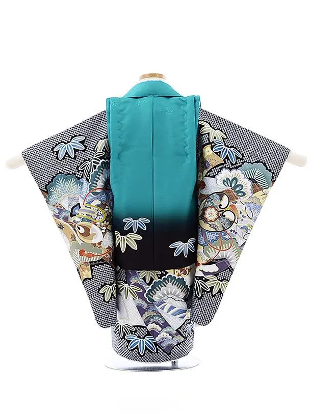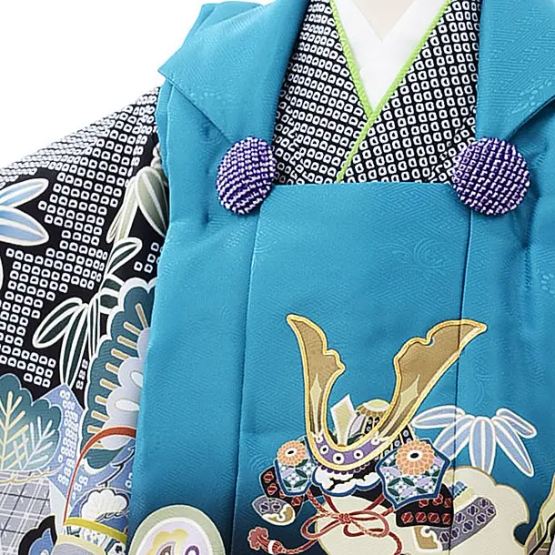 七五三レンタル(3歳男児被布)2725ブルー地兜x黒疋田柄吉祥文様