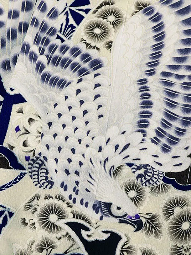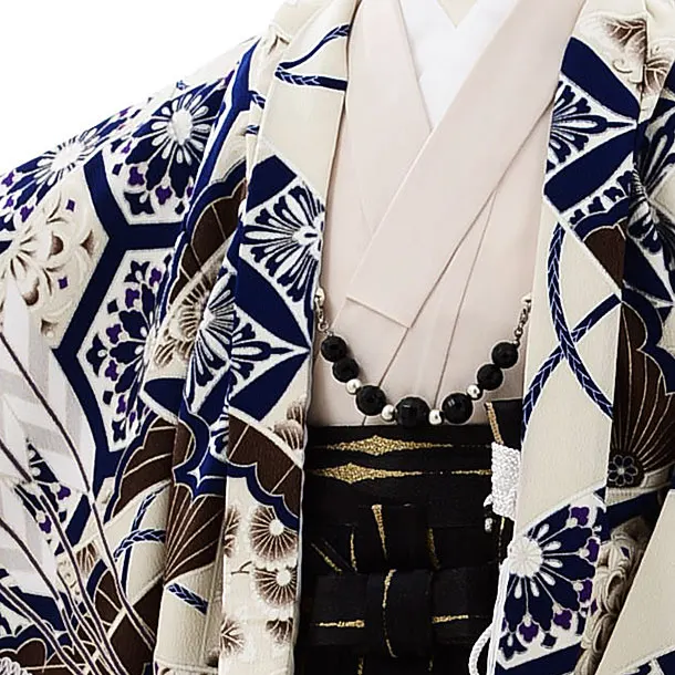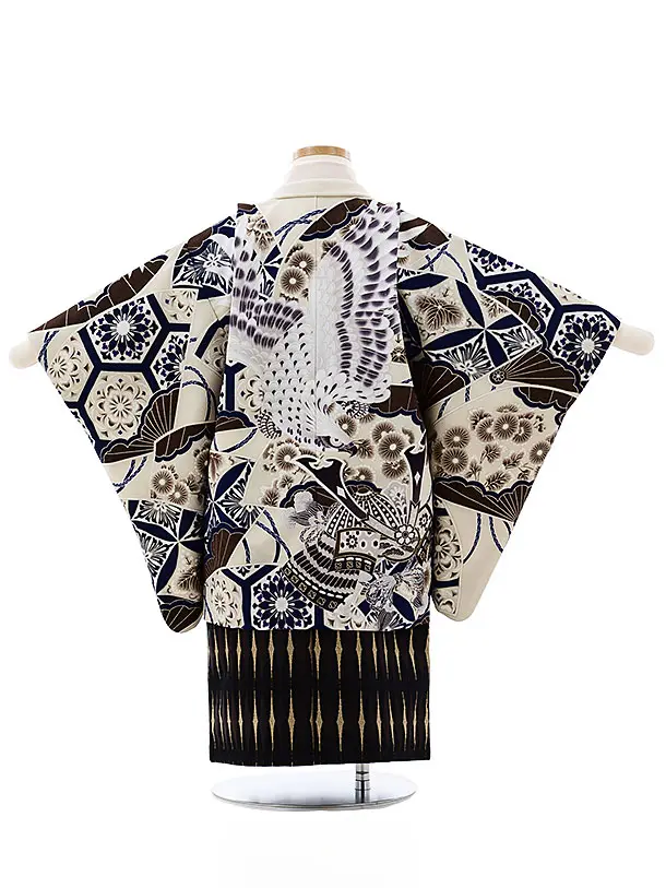 七五三レンタル(3歳男袴)2735蒼 ベージュ小紋鷹x黒ゴールド袴
