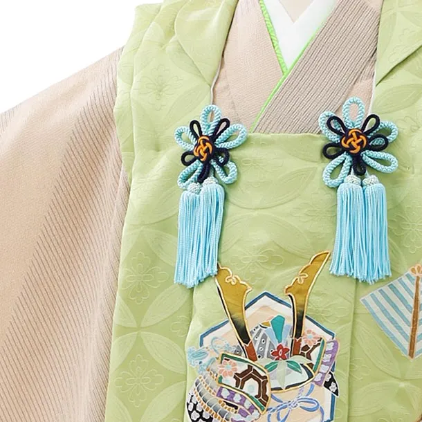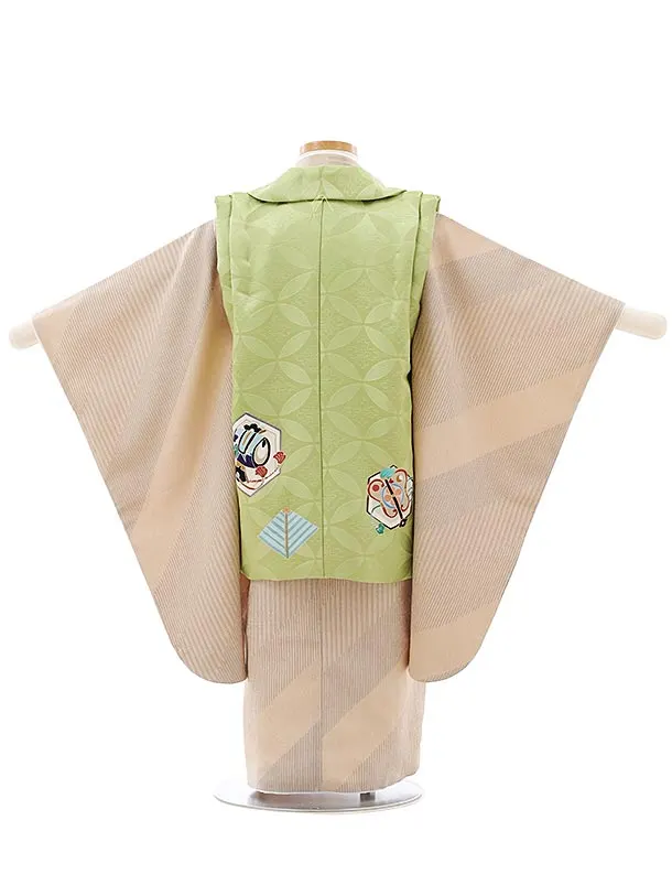 七五三レンタル(3歳男児被布)2738【正絹】ひわ色兜×ベージュ斜縞