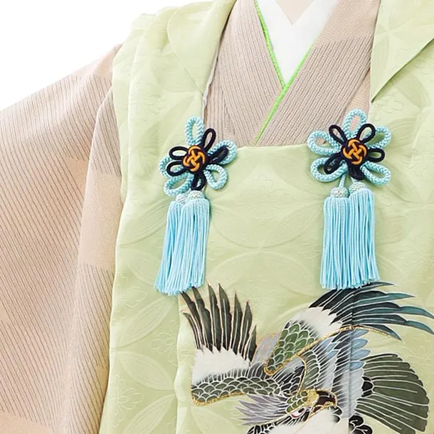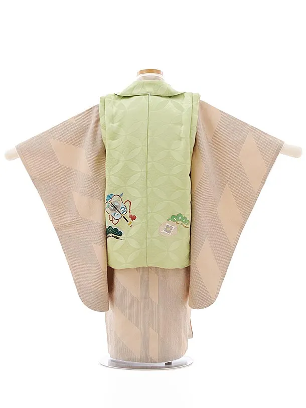 七五三レンタル(3歳男児被布)2739【正絹】ひわ色鷹×ベージュ斜格子