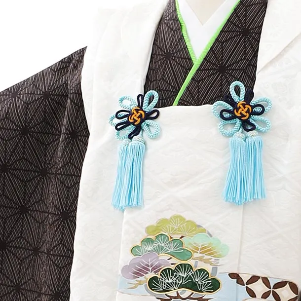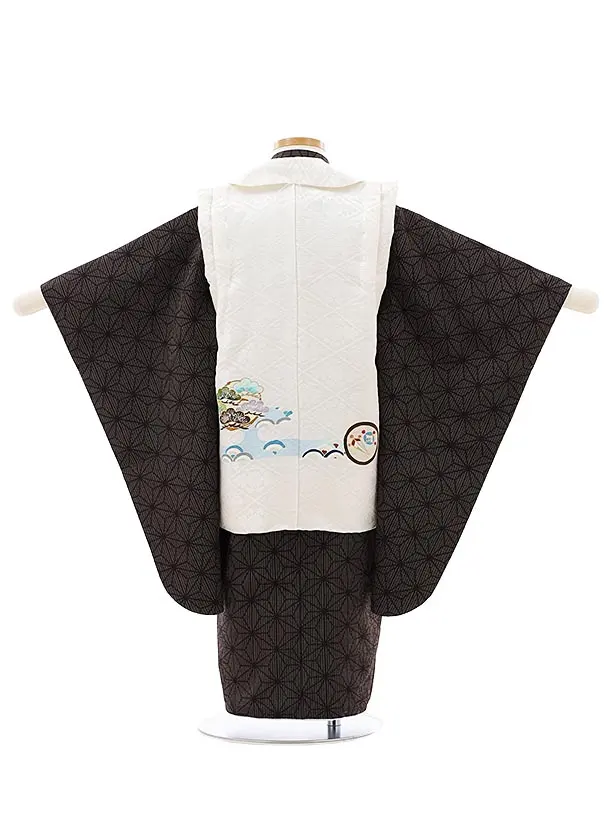 七五三レンタル(3歳男児被布)2744【正絹】ホワイト地松×こげ茶色麻の葉