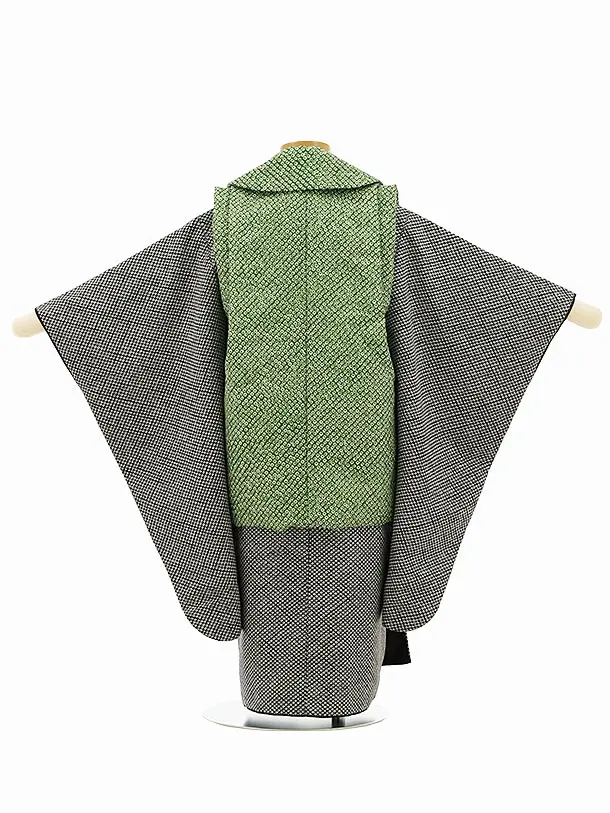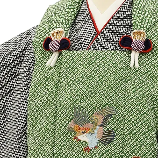七五三レンタル(3歳男児被布)2766グリーン地鷹刺繍x黒地疋田柄