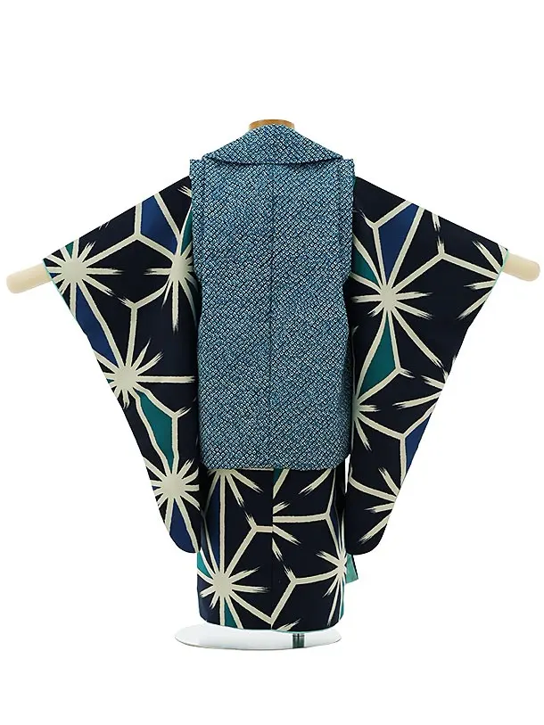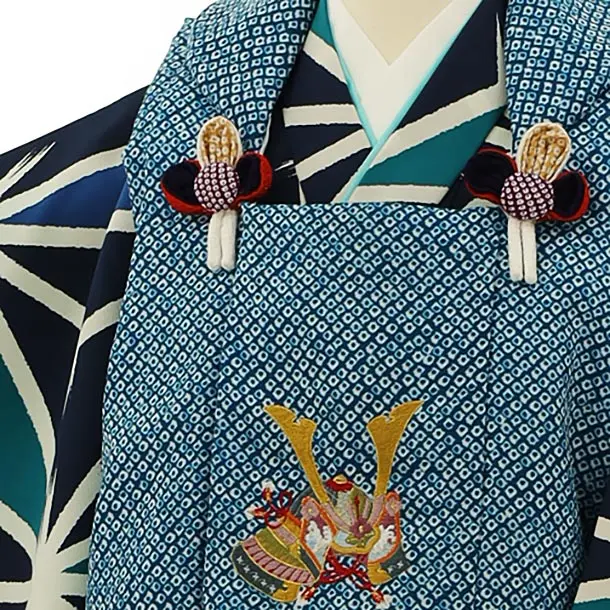 七五三レンタル(3歳男児被布)2773ブルー地兜刺繍x紺変わり麻の葉柄