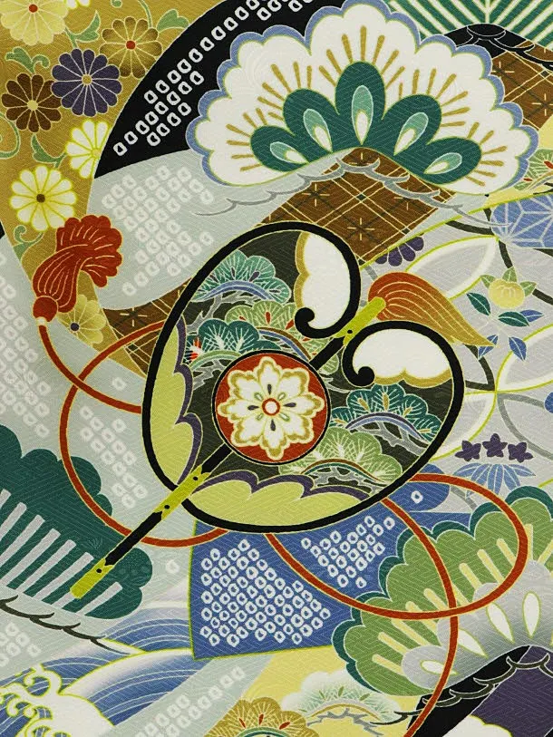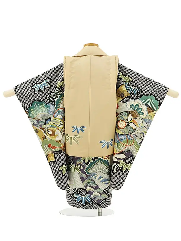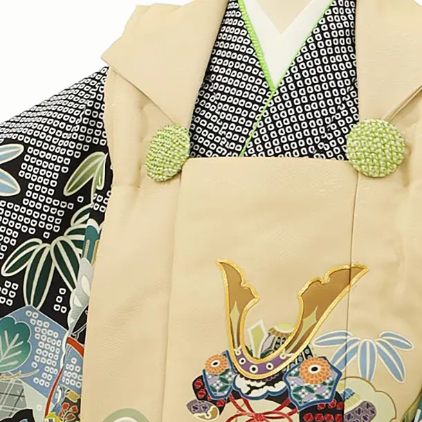 七五三レンタル(3歳男児被布)2783ベージュ兜x黒疋田柄松熨斗軍配