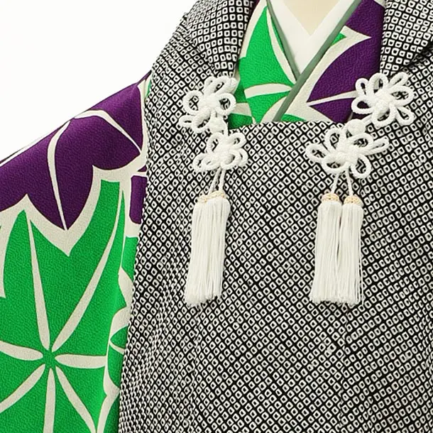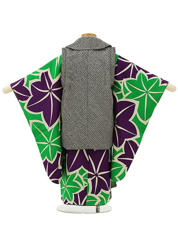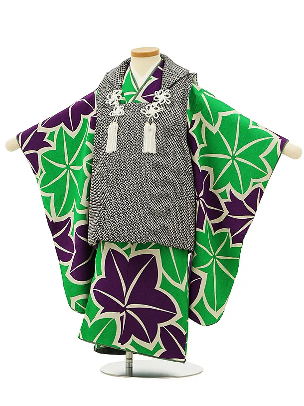 七五三レンタル(3歳男児被布)2788(正絹)黒地絞りxグリーンもみじ