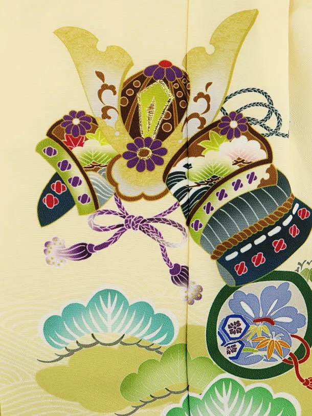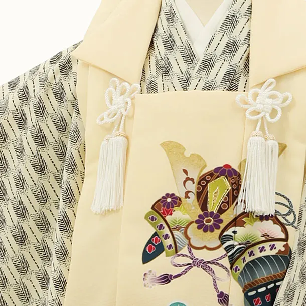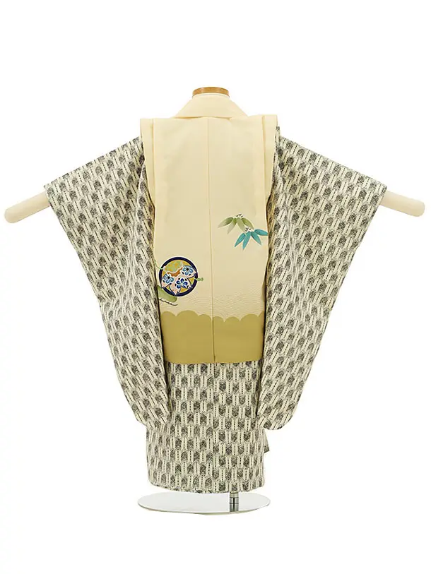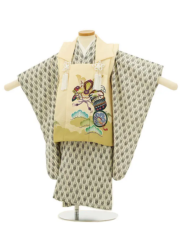 七五三レンタル(3歳男児被布)2800クリーム地松兜xアイボリー小紋