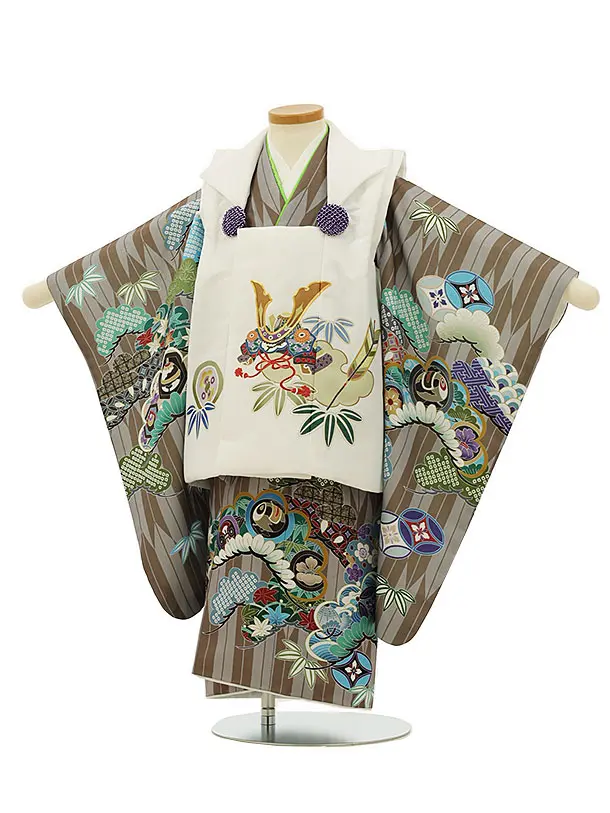 七五三レンタル(3歳男児被布)2811白兜xグレーブラウン矢羽根吉祥文様