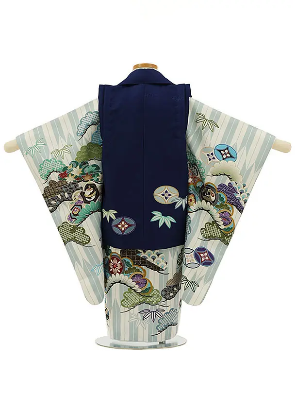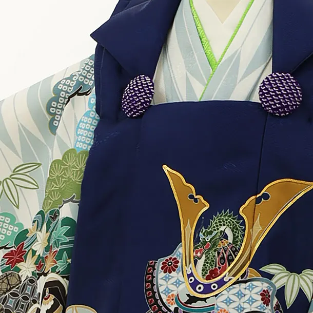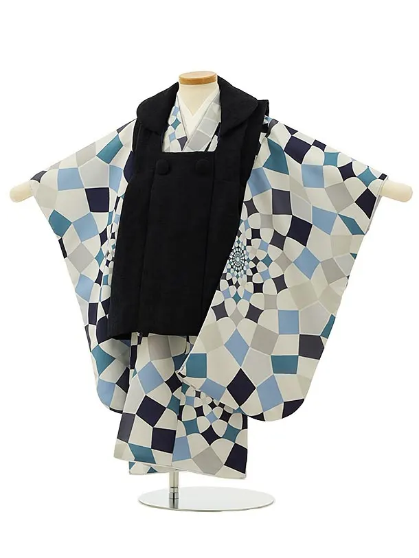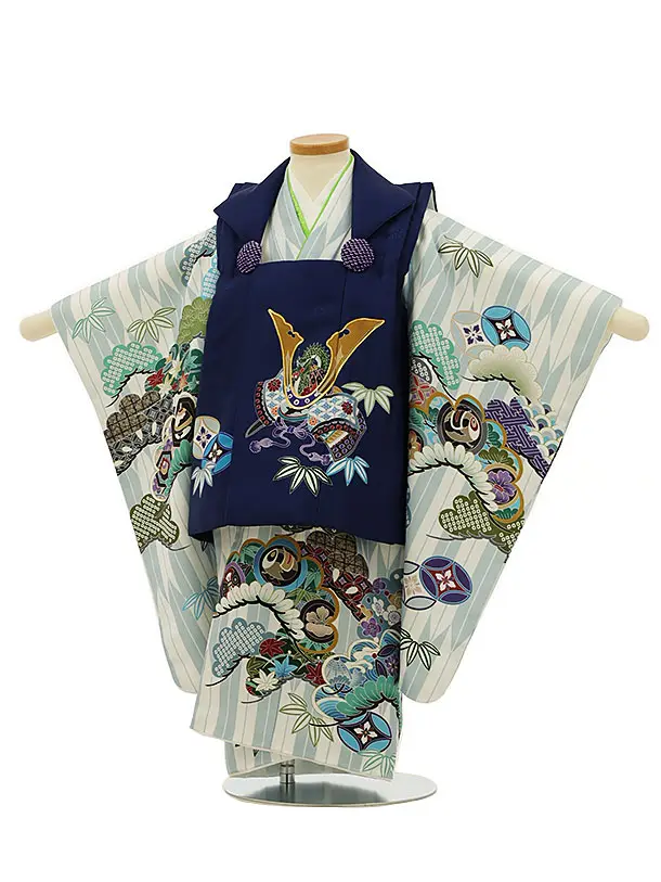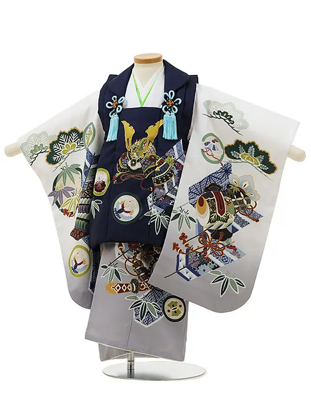 七五三レンタル(3歳男児被布)2818紺兜x白グレー矢羽根吉祥文様