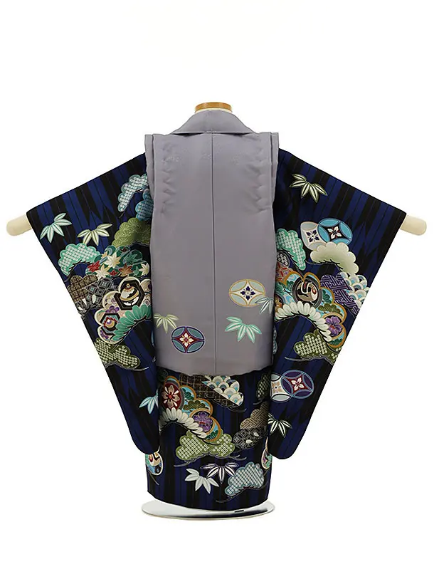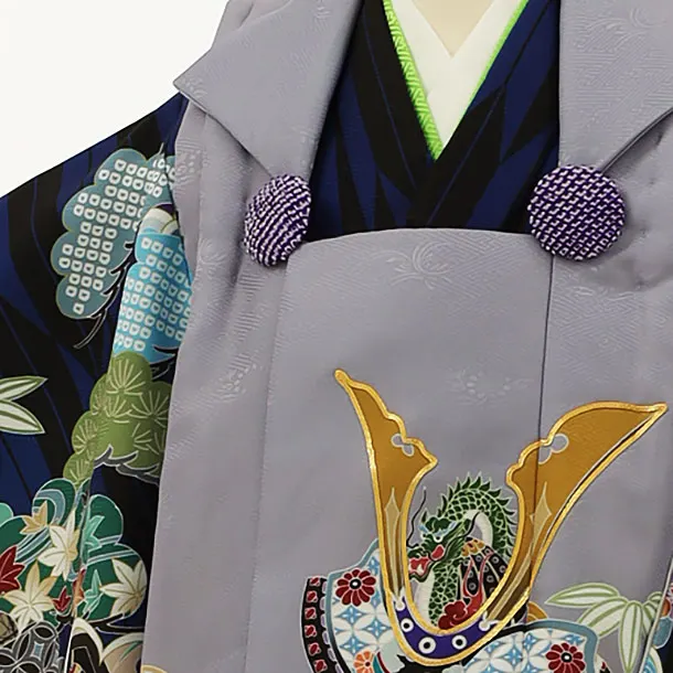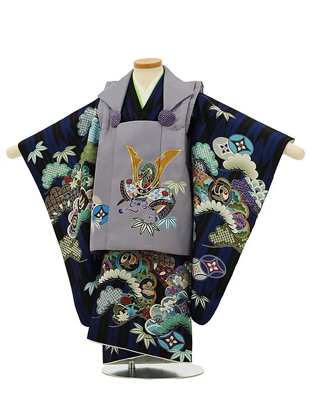 七五三レンタル(3歳男児被布)2825グレーパープルx黒ブルー矢羽根吉祥文様
