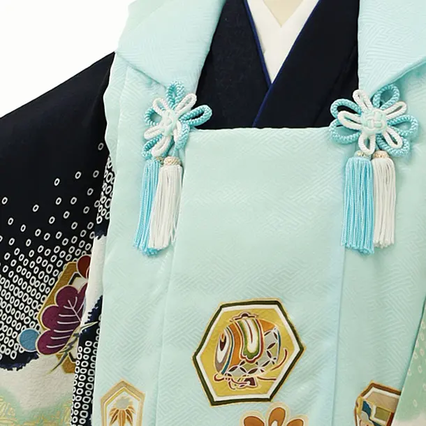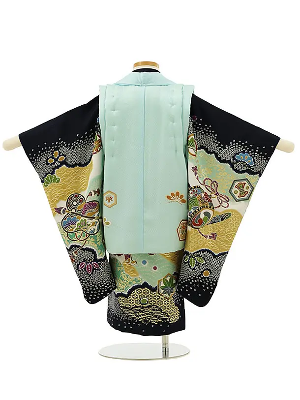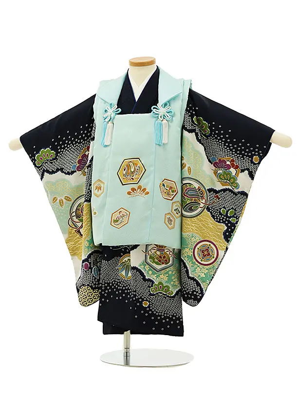 七五三レンタル(3歳男児被布)正絹 2828水色亀甲紋松x紺地雲取り丸紋