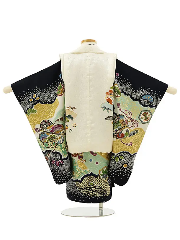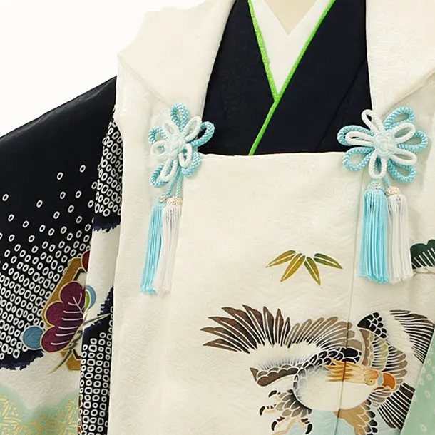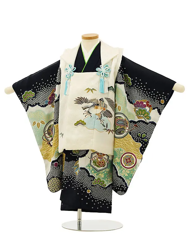 七五三レンタル(3歳男児被布)正絹 2829白地鷹x紺地雲取り丸紋