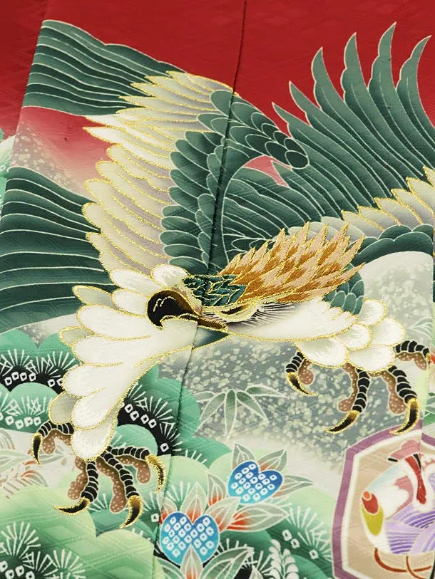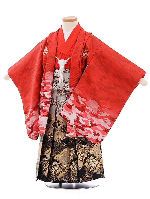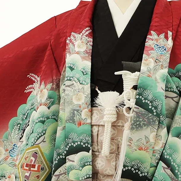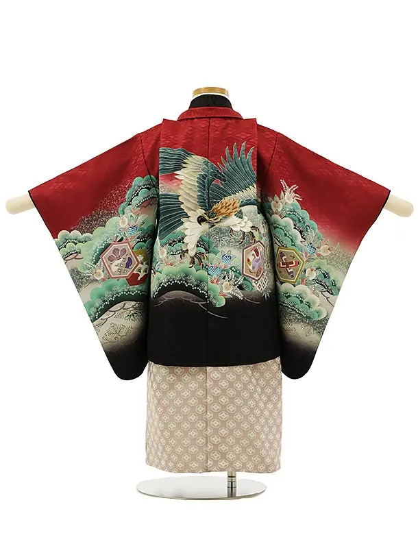 かんたん七五三(3歳男袴)2864エンジ色ぼかし松に六角宝鷹×ピンクベージュ袴
