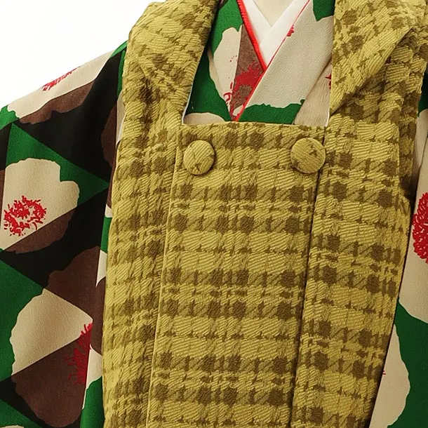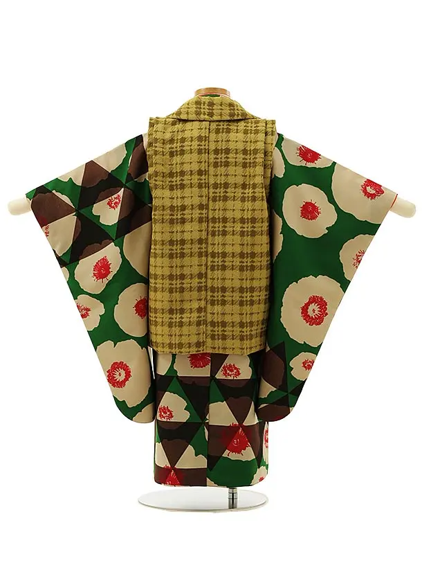 七五三レンタル(3歳男児被布)2891からし色チェック×グリーンポピー