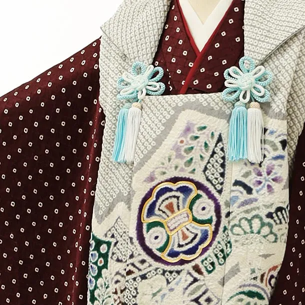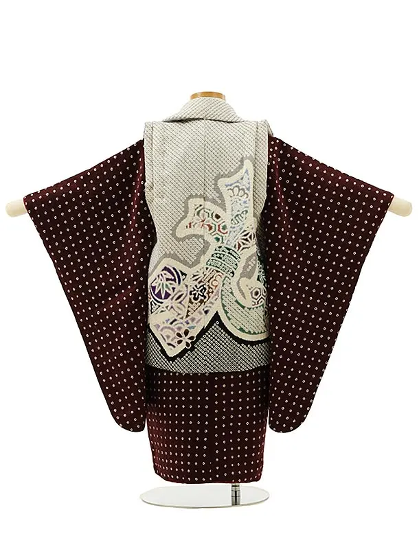 七五三レンタル(3歳男児被布)2897【正絹】絞りグレー束ね熨斗xバーガンディ