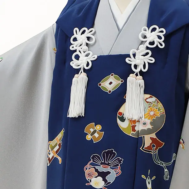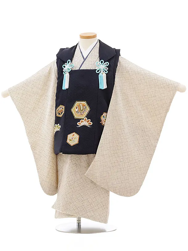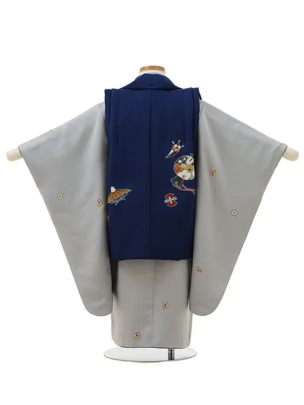 七五三(3歳男児被布)2929【正絹】紺小槌吉祥文様×グレー小紋