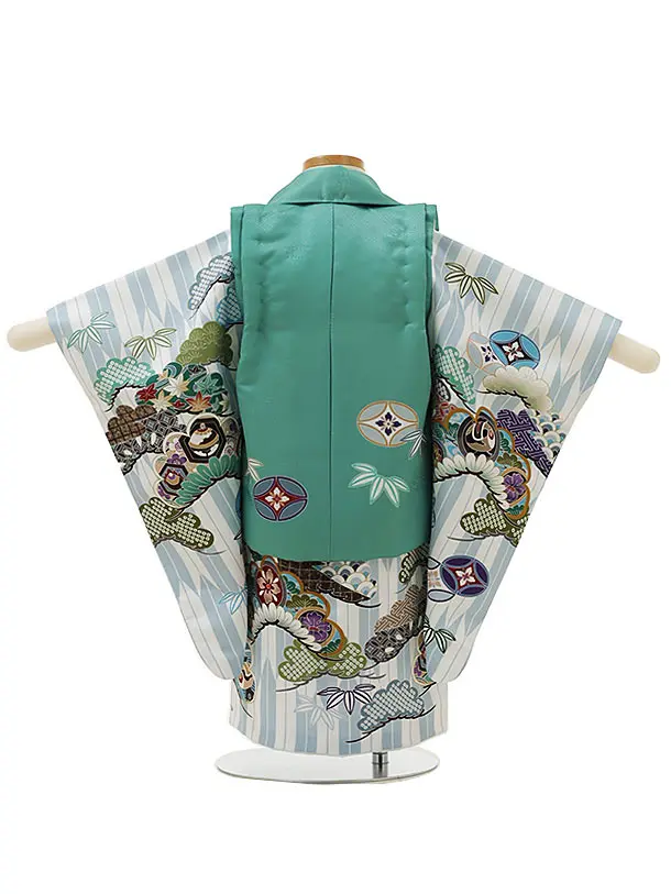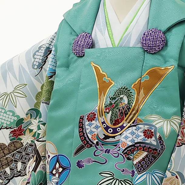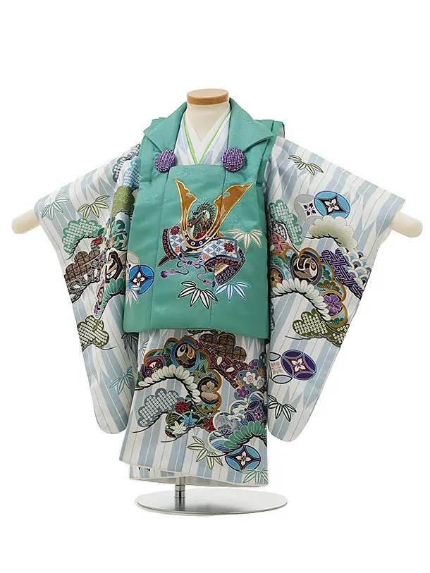 七五三レンタル(2歳男児被布)2963グリーン兜×グレー矢柄吉祥文様
