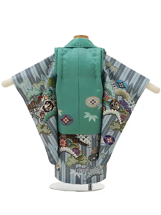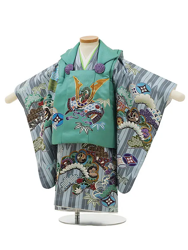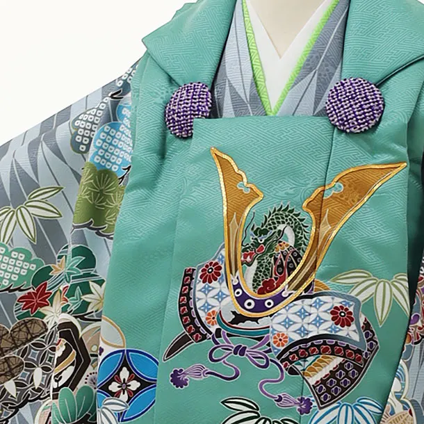七五三レンタル(2歳男児被布)2973グリーン兜×グレー矢柄吉祥文様