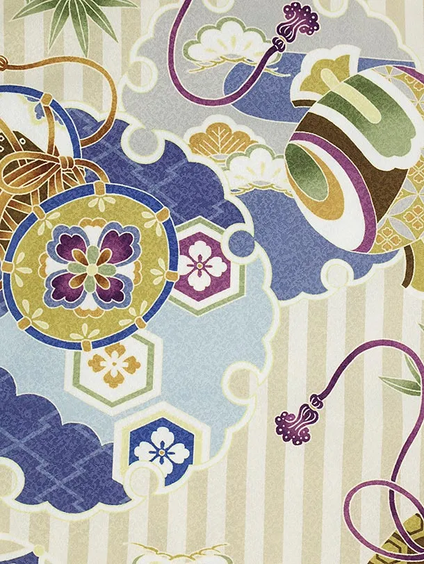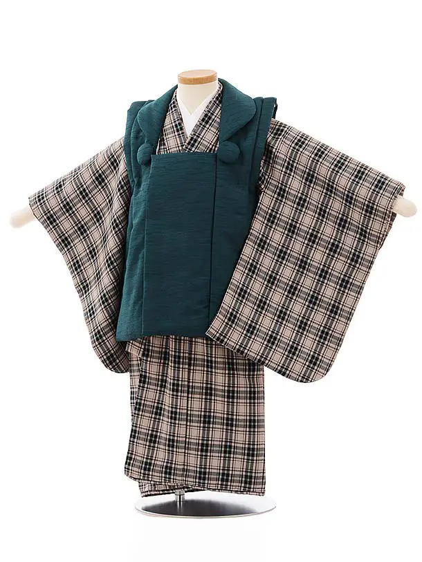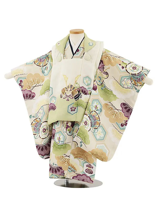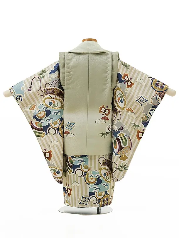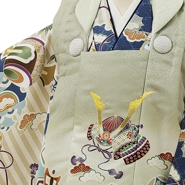 七五三(3歳男児被布)2995 グリーンベージュ兜×ベージュストライプおもちゃ