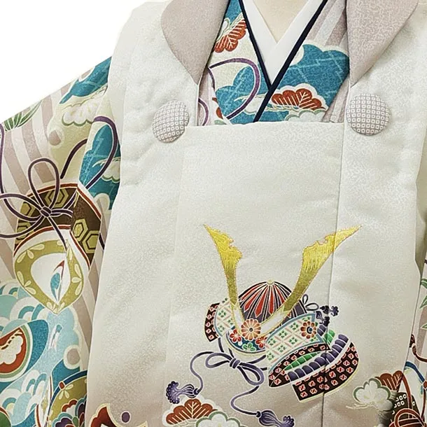 七五三(3歳男児被布)2996 白ベージュぼかし兜×モカベージュぼかしおもちゃ