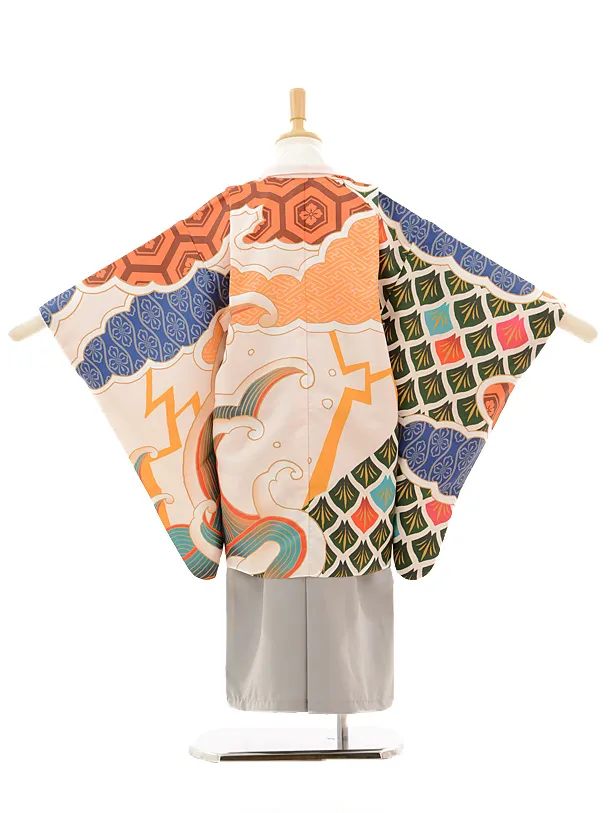 七五三レンタル(5歳男の子袴)5152雲波多色柄アイボリー×灰水色袴