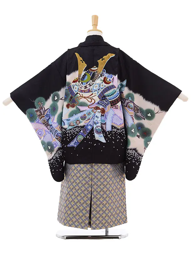 かんたん七五三レンタル(5歳男の子袴)5176黒地のしめかぶと×グレー袴
