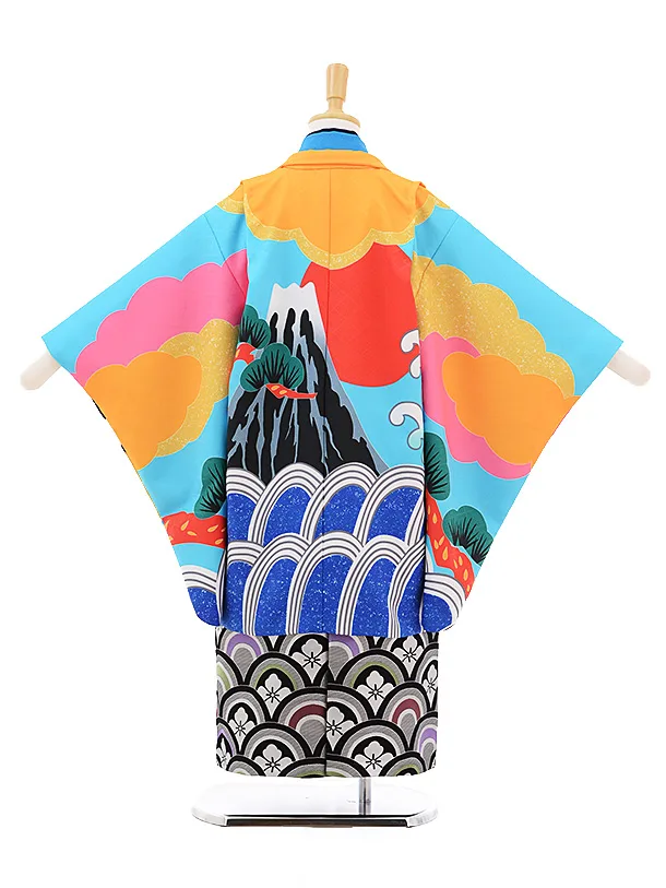 七五三レンタル(5歳男の子袴)5210花わらべ水色ブルー富士に鶴×黒地袴
