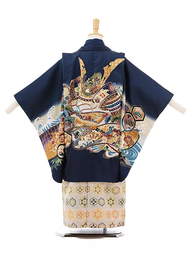 かんたん七五三レンタル(5歳男の子袴)5227紺地波にかぶと×ベージュ袴