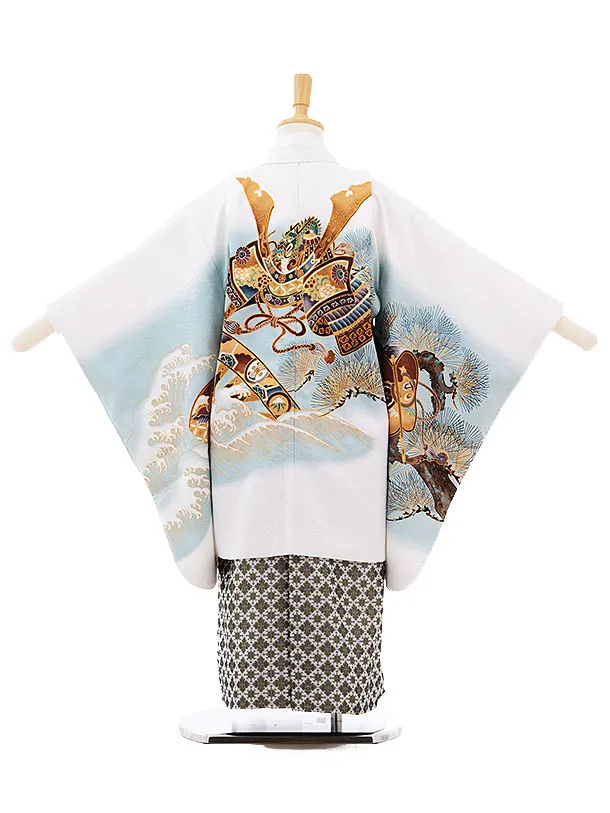 七五三レンタル(5歳男の子袴)5255白地波にかぶと×グレー地金ラメ袴