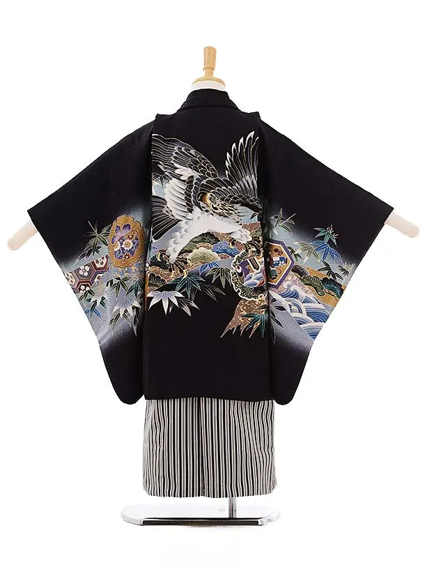 七五三レンタル(5歳男袴)5274 黒地 鷹 (羽織正絹)×黒縞袴