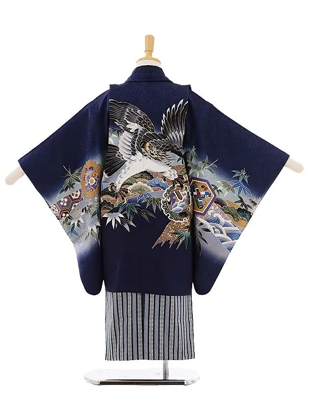 七五三レンタル(5歳男袴)5280 紺地 鷹 (羽織正絹)×水色銀縞袴