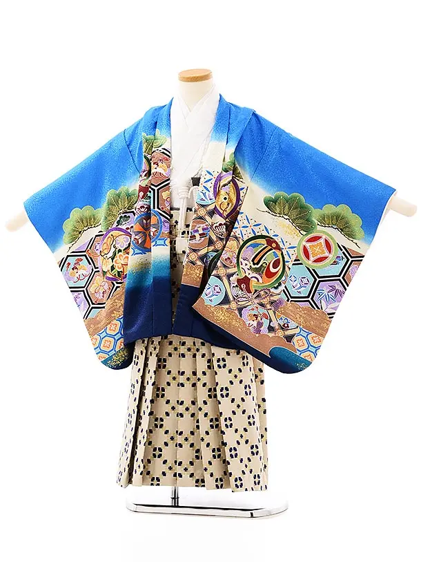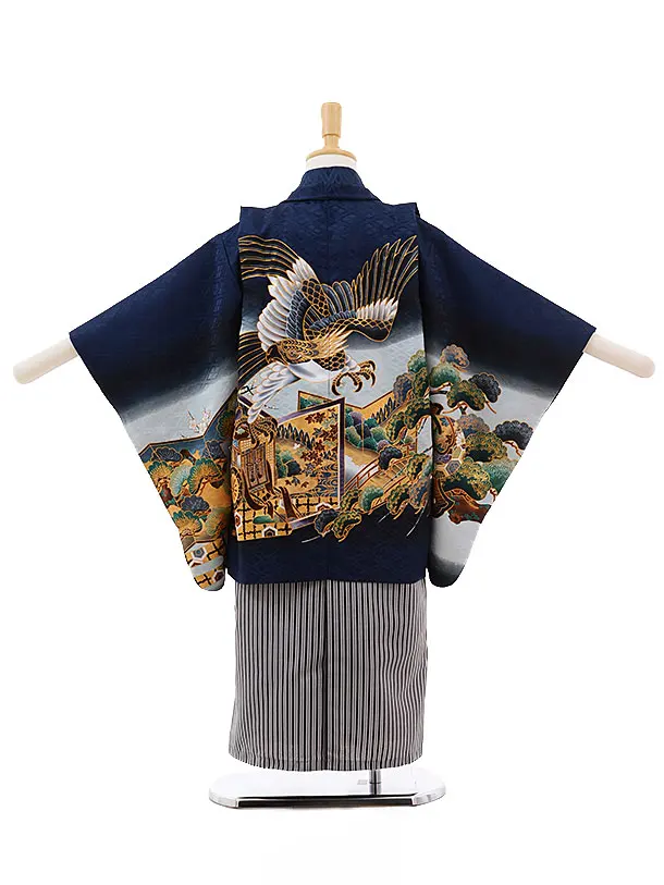 かんたん七五三(5男袴)5301 紺地 松に鷹×黒縞袴