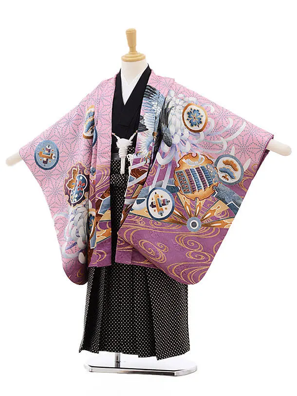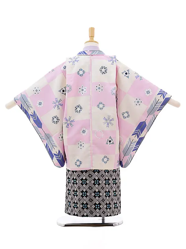 かんたん七五三(5男袴)5314 ピンク 市松に矢柄×黒地シルバー水色柄袴
