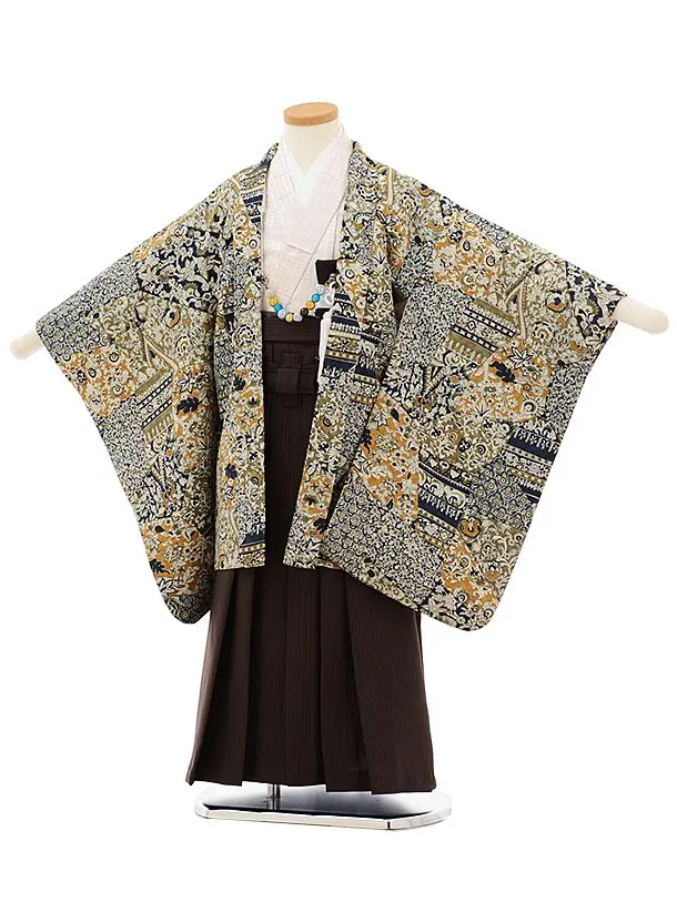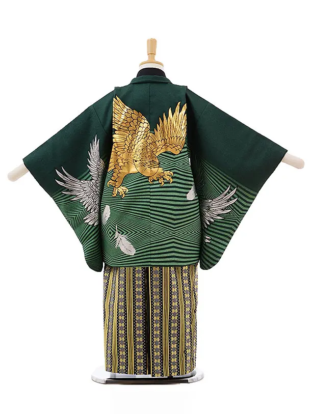 かんたん七五三(5歳男袴)5334 グリーン地 ゴールド 鷹×グレー地袴