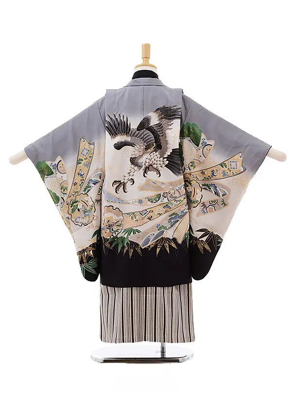 七五三レンタル(5男袴)5336グレーぼかし鷹(羽織 正絹)×シルバーラメ袴