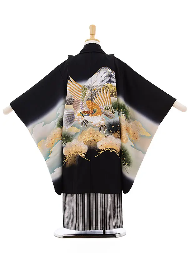 七五三レンタル(5歳男袴)5346 (正絹)黒地 松に鷹 刺繍×黒縞袴