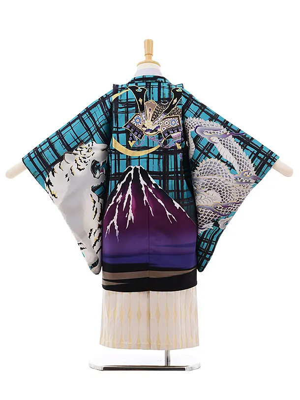 七五三レンタル(5歳男袴)5371 蒼 ターコイズ 富士にかぶと虎に龍×白地袴