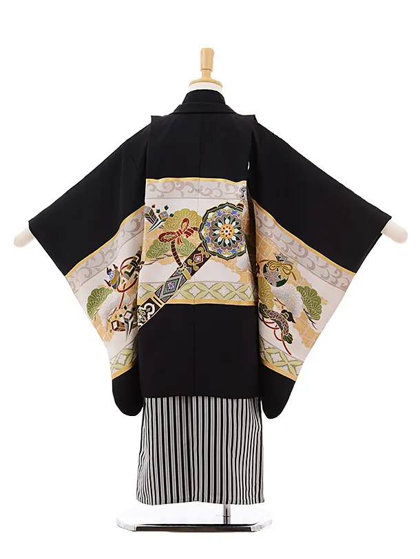 七五三(5歳男袴)5376 (正絹)黒地 屏風 絵×黒縞袴