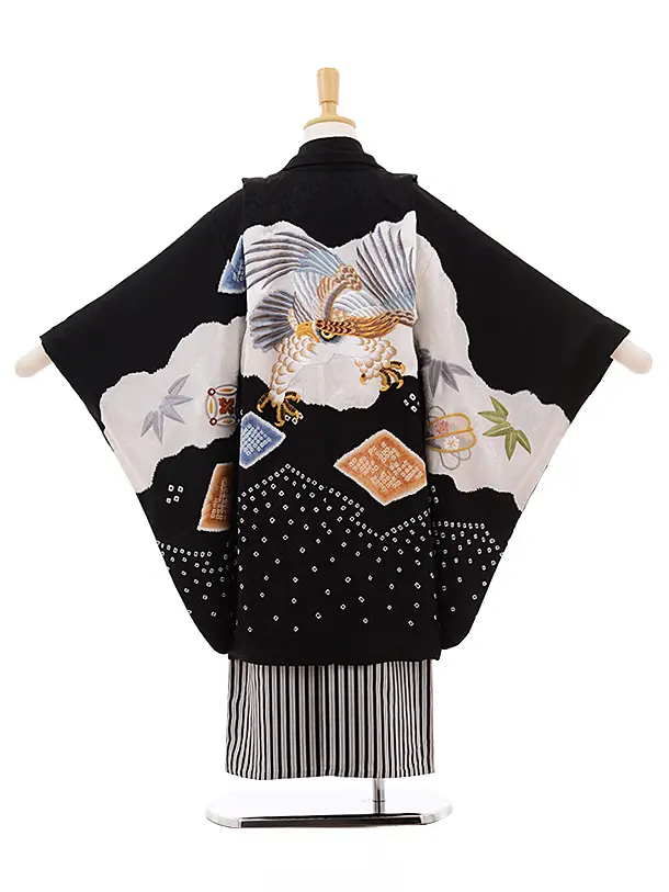 七五三(5歳男袴)5380 (正絹)黒地 絞り 小槌 鷹 刺しゅう ×黒縞袴