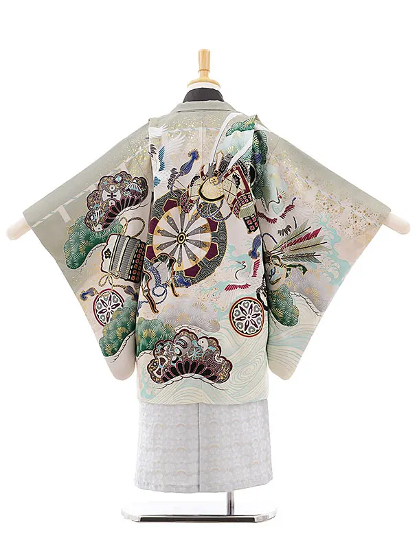 七五三(5歳男袴)5400 乙葉グリーンベージュ源氏車にかぶと×白地水色袴
