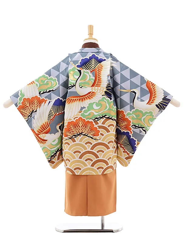 かんたん七五三(5歳男袴)5429 ぷちぷり ブルーグレー 波に鶴×黄土色袴