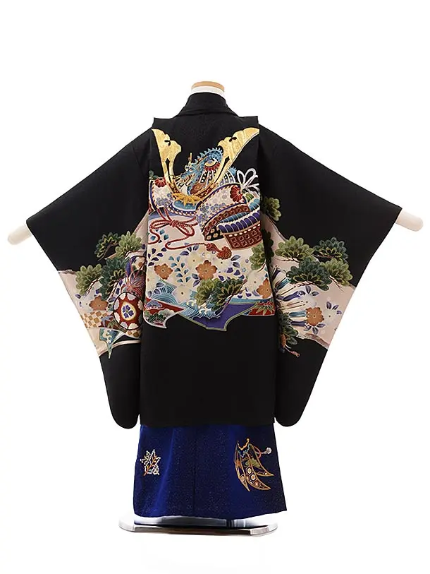七五三(5.6歳男児袴)5445 (正絹) 黒地 松にかぶと×ブルー刺繍袴