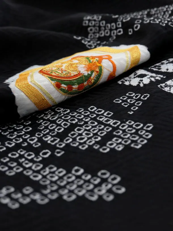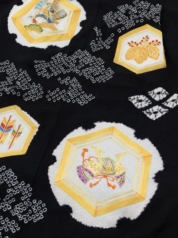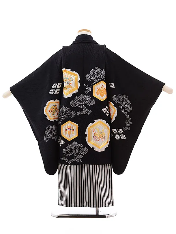 七五三(5.6歳男児袴)5459 (高級正絹)黒地 絞り 亀甲 刺繍×黒縞袴